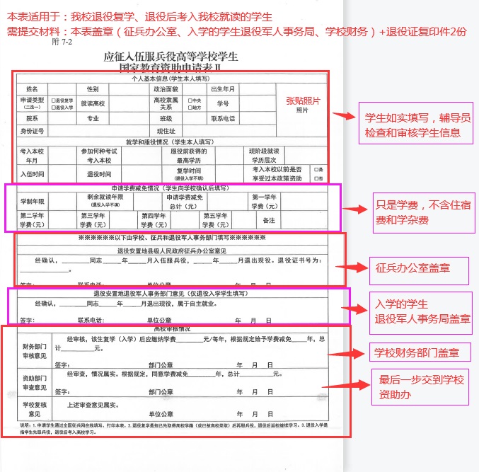 学生登录全国征兵网注册报名,完成填写后从系统下载打印《应征入伍服兵役高等学校学生国家教育资助申请表Ⅱ》(附件2),将此表分别拿到学校财务处、入伍地方县级武装部盖章,贴好个人1寸照片(底色不限),最后提交材料包括此表盖好章的原件2份和《退役证书》复印件2份。申请学生通过全国征兵网在线填写、打印此表(手填或复印无效)。