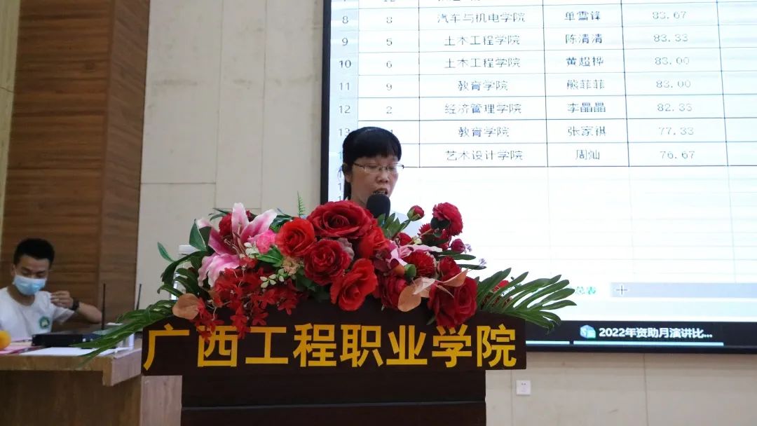 比赛结束后,黄秋霞副书记对比赛进行点评总结。她对本次比赛给予充分肯定,并就选手的演讲内容、表达技巧、精神面貌等方面进行点评,提出了建议和意见。同时,号召同学们要牢记习近平总书记的嘱托,做理想远大、信念坚定的模范,做刻苦学习、锐意创新的模范,做敢于斗争、善于斗争的模范,做艰苦奋斗、无私奉献的模范,做崇德向善、严守纪律的模范。为实现个人的青春梦、学校“升本梦”和中华民族伟大复兴的中国梦砥砺前行,努力奋斗!用实际行动追梦铸梦,不负党和人民的殷切期望,以实际行动回报父母、回报学校、回报社会、回报国家。