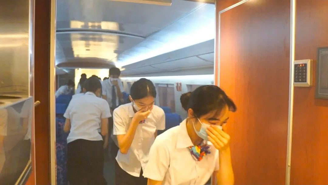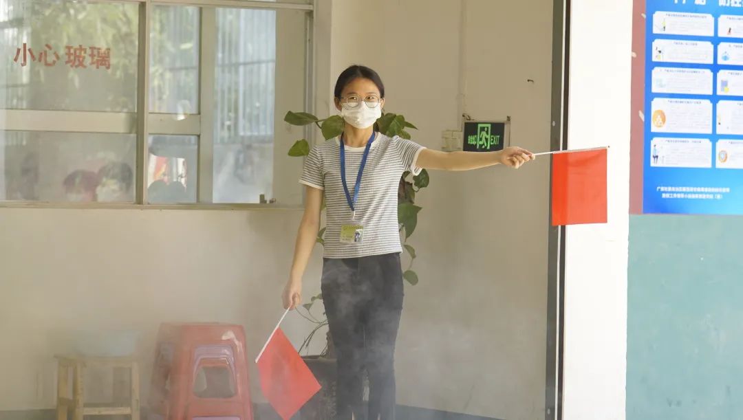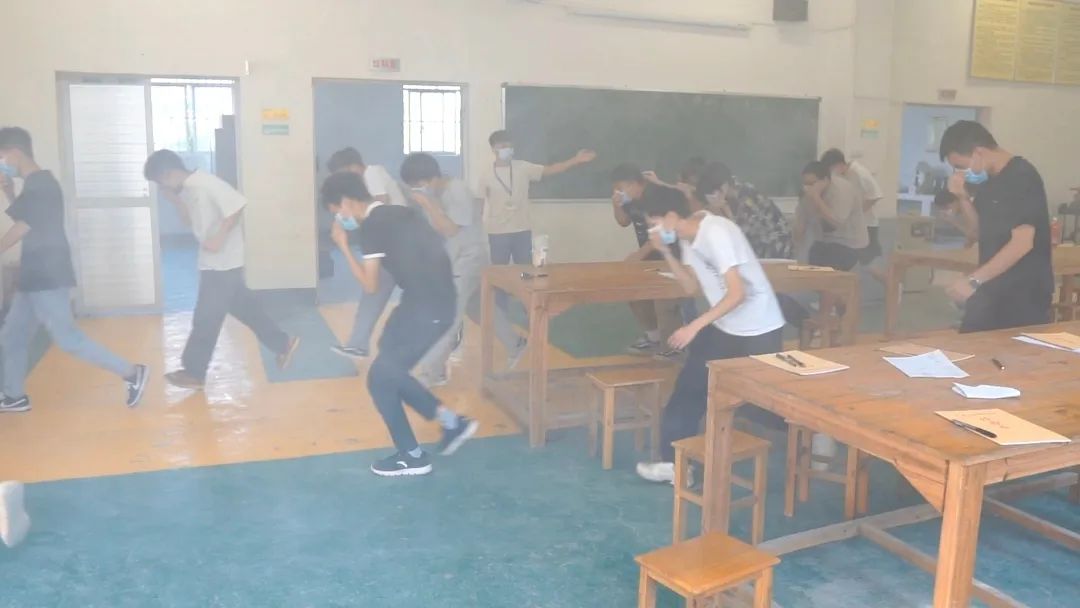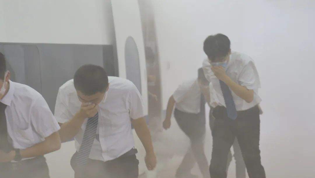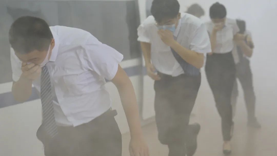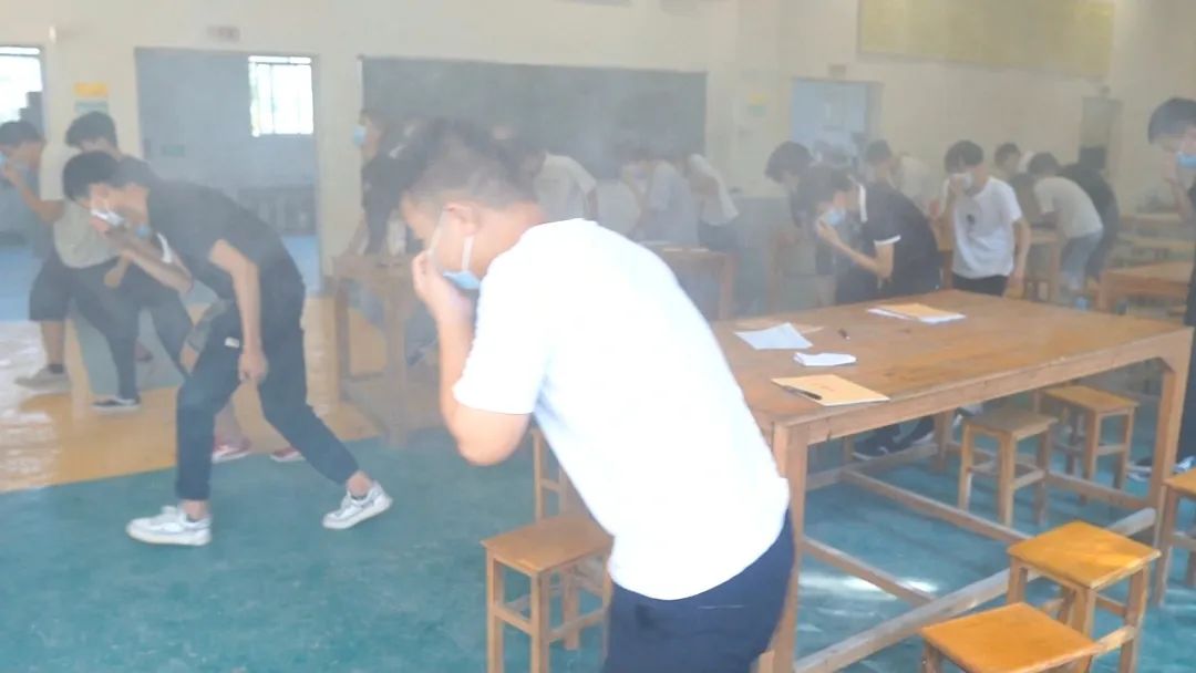同学们手持湿毛巾掩住口鼻,采取低姿势