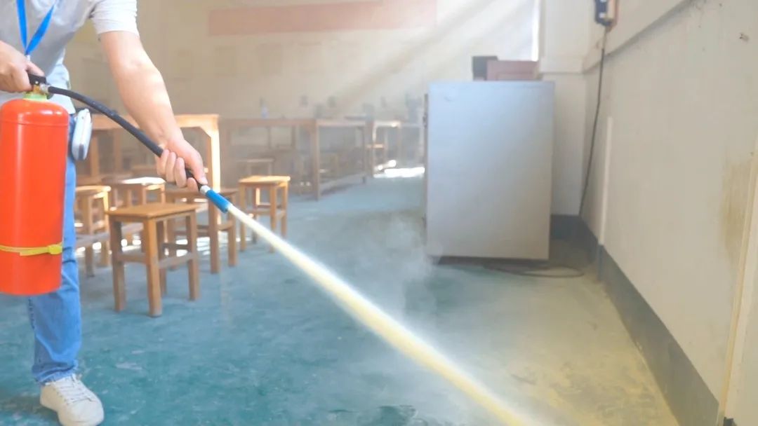 3.将灭火器喷头对准起火处,使劲按下灭火器交叉按压的地方,对准火源一直按压到火灭掉为止。