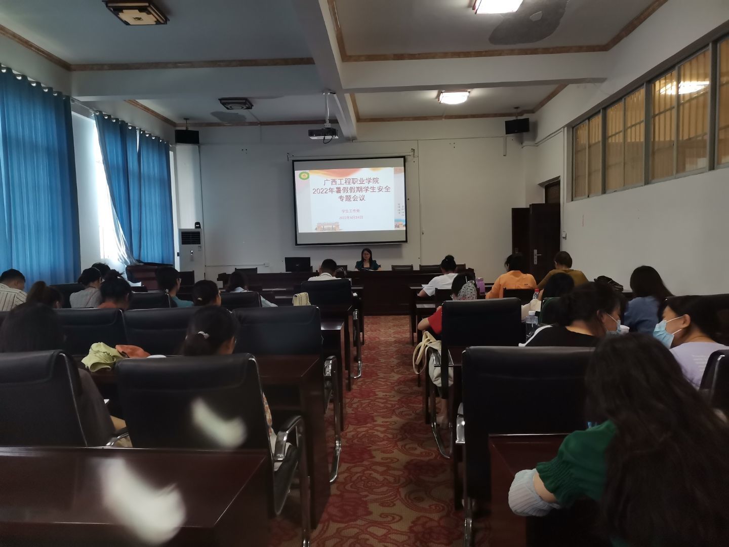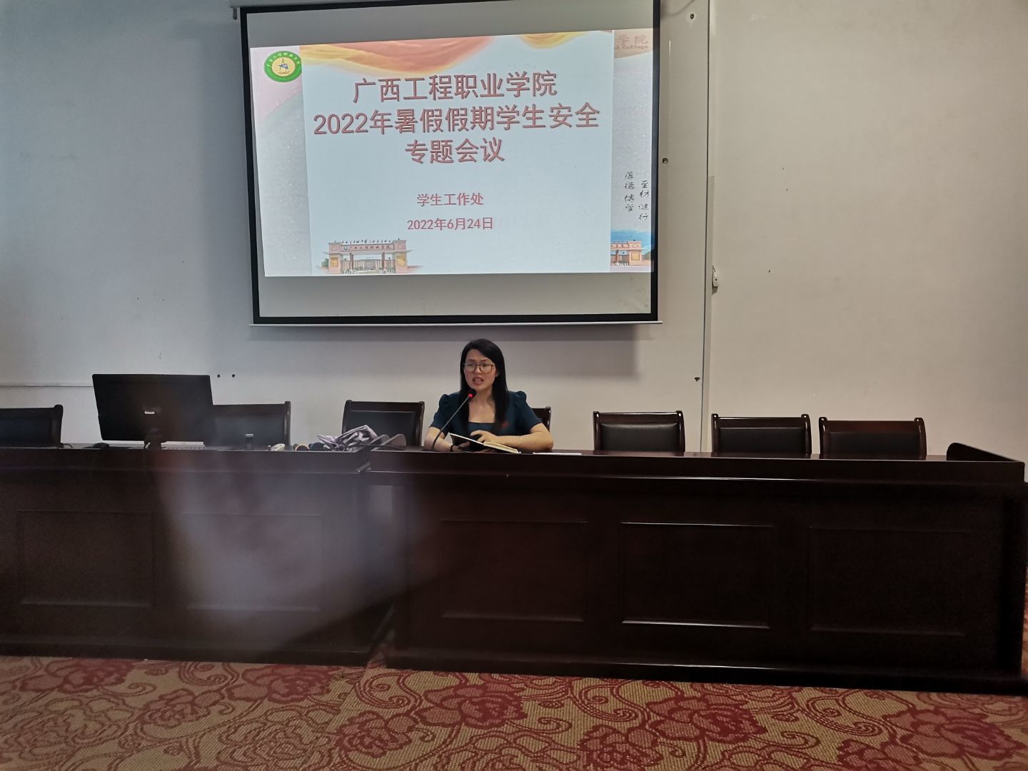 为增强学生暑假安全意识,安排好暑假的相关事宜。6月24日,学生工作处在图书馆一楼学术报告厅召开2022年暑假假期学生安全工作专题会议。学校党委副书记黄秋霞、学生工作处副处长李丽诗、各二级学院负责人、学生科长、辅导员参加本次会议。