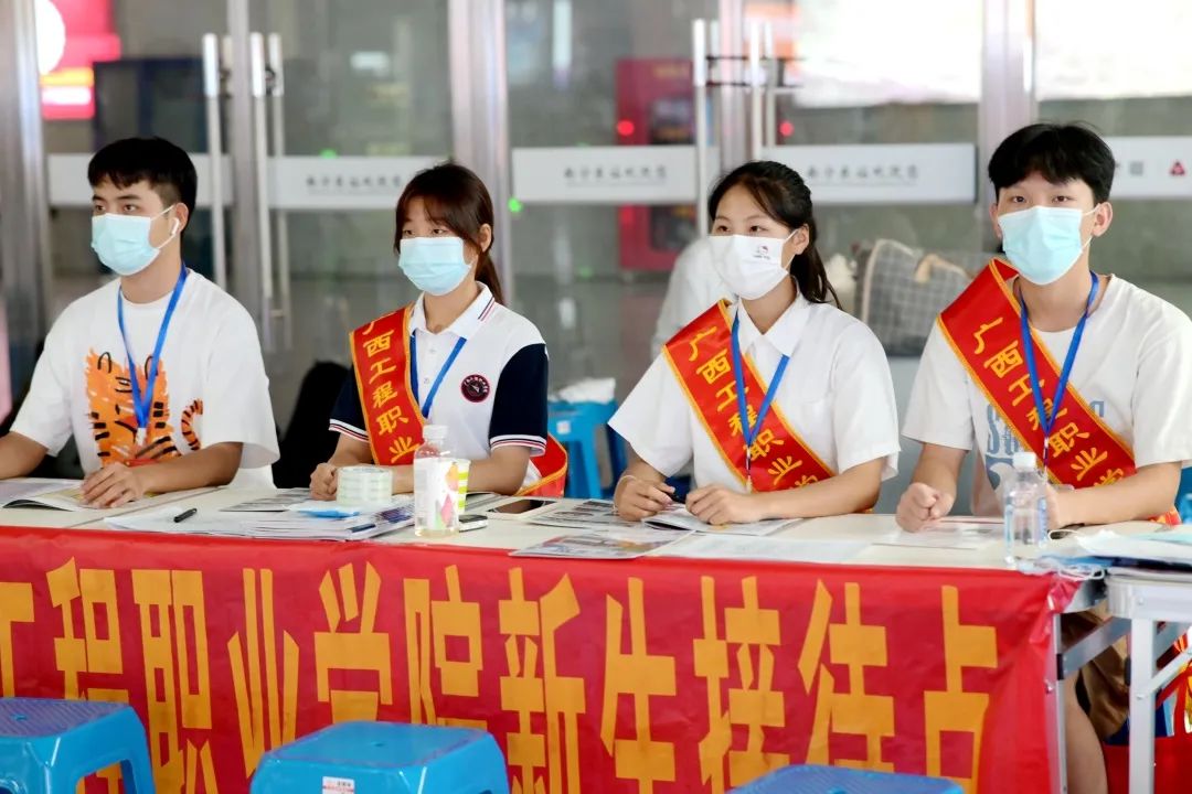 志愿者在火车站出站口引领新生及其家长到接待处