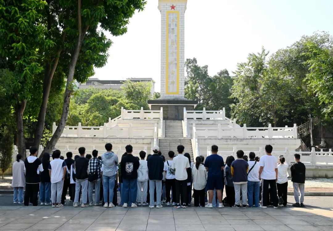平果市烈士陵园绿树环绕,丰碑耸立,庄严肃穆。全体学员面向革命烈士纪念碑肃立默哀,致敬英烈。