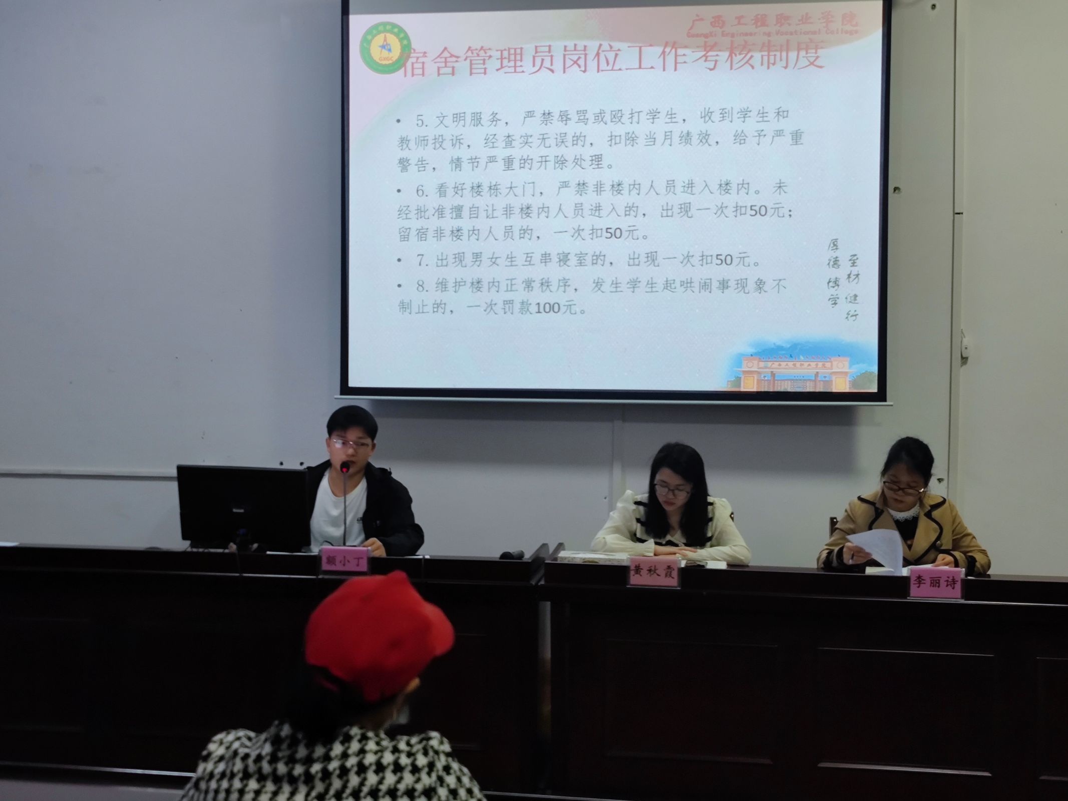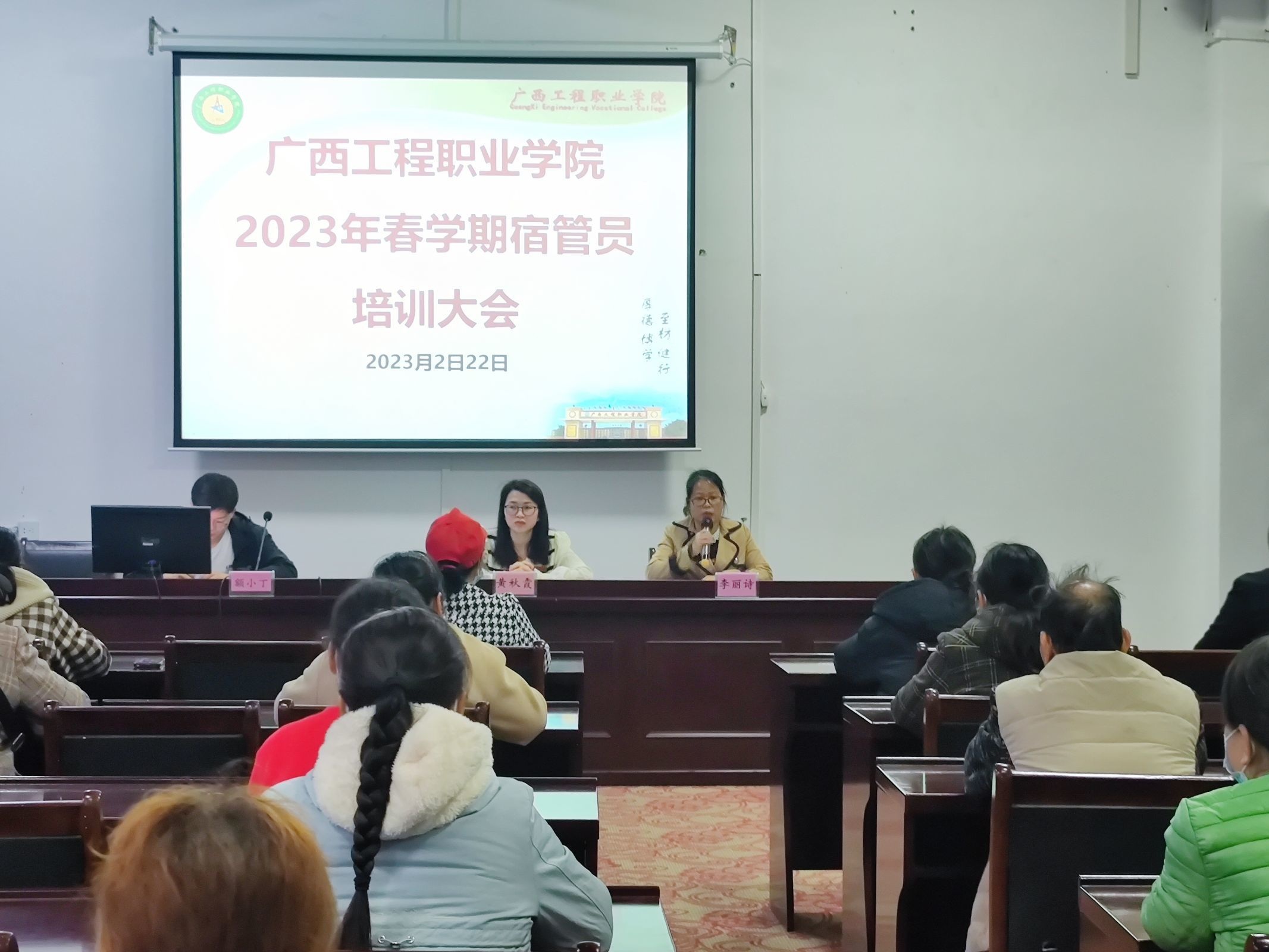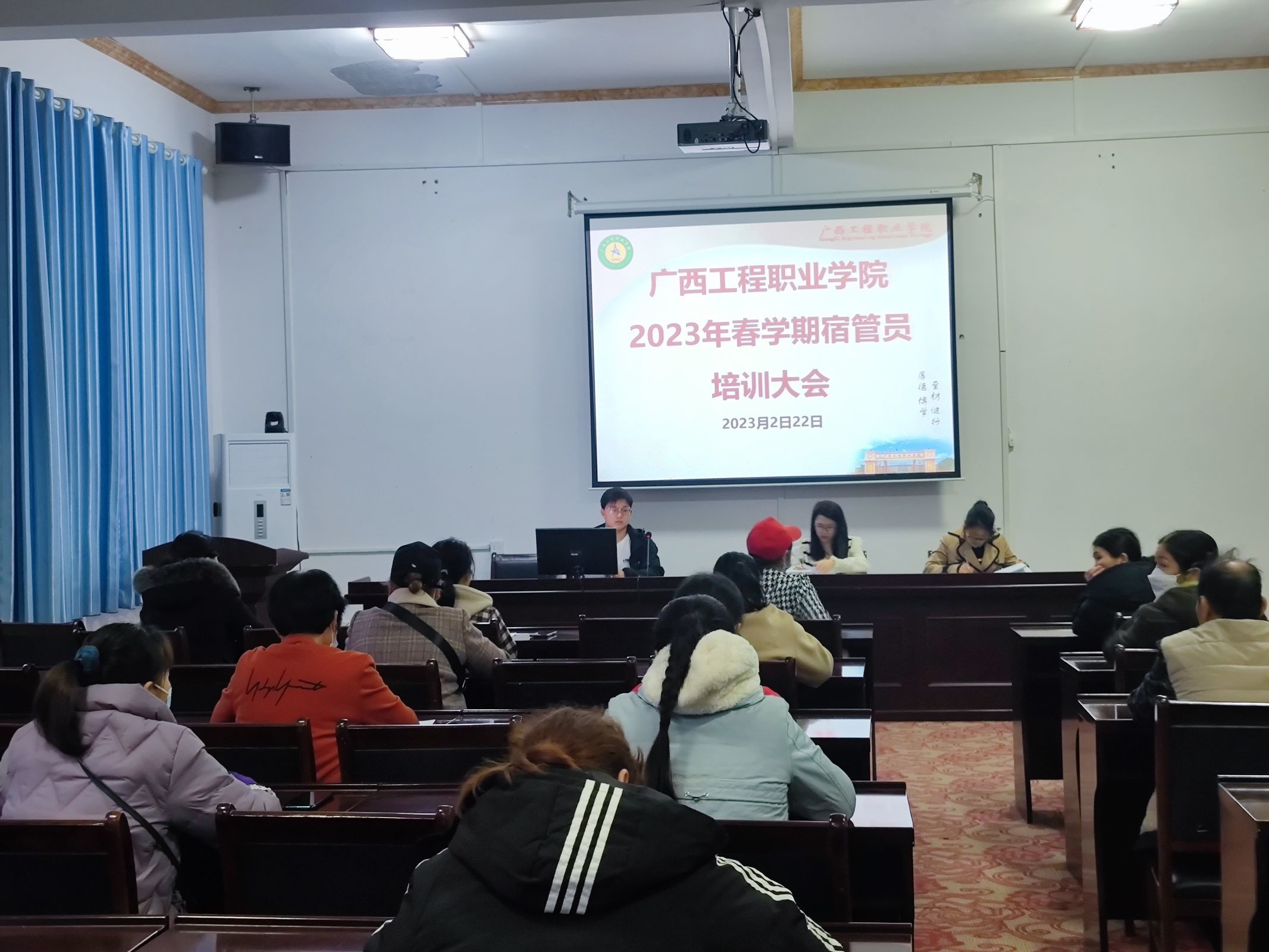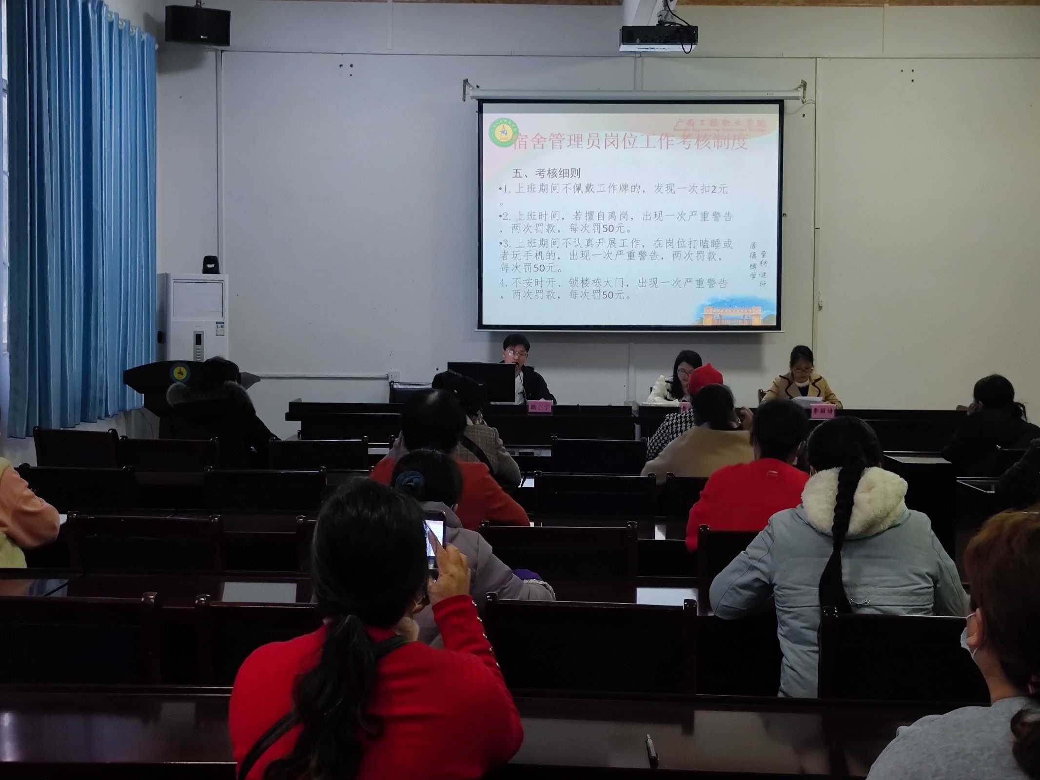 为加强学生宿舍管理人员队伍建设,全面提升宿舍管理员的管理水平和整体素质,增强安全意识、服务意识,进一步提高宿舍管理工作方法,2月22日,学生工作处在图书馆一楼学术报告厅组织开展了全体宿舍管理人员业务能力提升培训会,学校党委副书记黄秋霞出席会议,学生工作处副处长李丽诗、学生工作处宿管科额小丁老师及全体宿管员参加会议。
