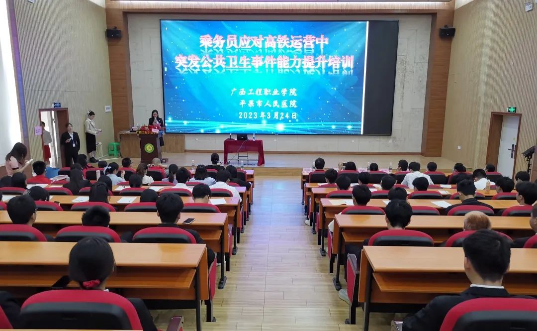 为进一步提升高速铁路客运服务专业学生的应急处置能力、应急处理的协调配合以及保障应急处置的效果,有效预防、及时控制和消除突发公共卫生事件的危害,为铁路企业培养出具有一定应急处理能力的、高素质技术技能人才,铁道与航空学院联合平果市人民医院于3月24日下午在校图文信息大楼一楼学术报告厅开展乘务员应对高铁运营中突发公共卫生事件能力提升培训活动暨平果市人民医院健康知识进校园文明实践志愿服务活动 。 铁道与航空学院党支部书记、院长覃凤姣,平果市人民医院骨外科副主任苏卫松、平果市人民医院第二十党支部书记宋丽红、平果市人民医院第十六党支部组织委员黄春梅、平果市人民医院第十六党支部杨才印医师、平果市人民医院感染性疾病科郭欣欣医师等出席了活动现场。铁道与航空学院师生代表参加了活动。