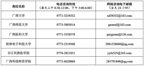 特别提示:广西社会大众和广大师生需要咨询时,可根据个人实际选择其中一所高校的一种联系方式(电话或发送电子邮件)进行咨询,其中电话咨询请在指定的时间范围内进行。心理咨询团队将会在24小时内,由所咨询高校的专家进行口头回复。为方便回复,请咨询者告知本人的姓氏、性别、籍贯、联系方式(如手机、微信号、QQ号等)、身份(如确诊患者、到医院就诊的发热患者、疫情防控一线工作人员、普通公众、高校师生、中小学师生等),并简单描述个人目前面临的主要心理问题。