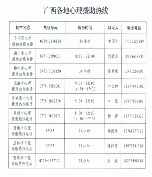 4.畅通咨询热线。辅导员转发教育部心理援助热线、广西心理援助热线以及区内各高校的心理支持热线帮助师生有效排解疫情下的心理压力。并转发beat365学生工作处大学生心理健康教育与咨询中心电话:0776-5728789。