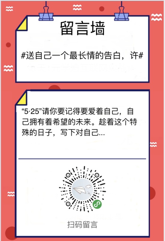5.开展线上留言墙活动。在微信小程序中“送自己一个最长情的告白,许自己一个最美好的未来”留言墙中,留下对自己的告白,许下对未来的美好期冀。