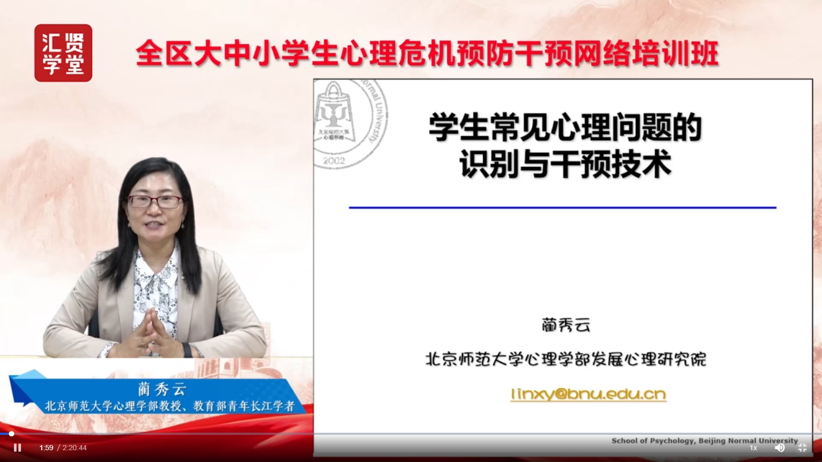 此次网络培训一共有两场,第一场为北京师范大学心理学部教授、博士生导师、教育部青年长江学者蔺秀云教授讲授关于《学生常见心理问题的识别与干预技术》的课程。