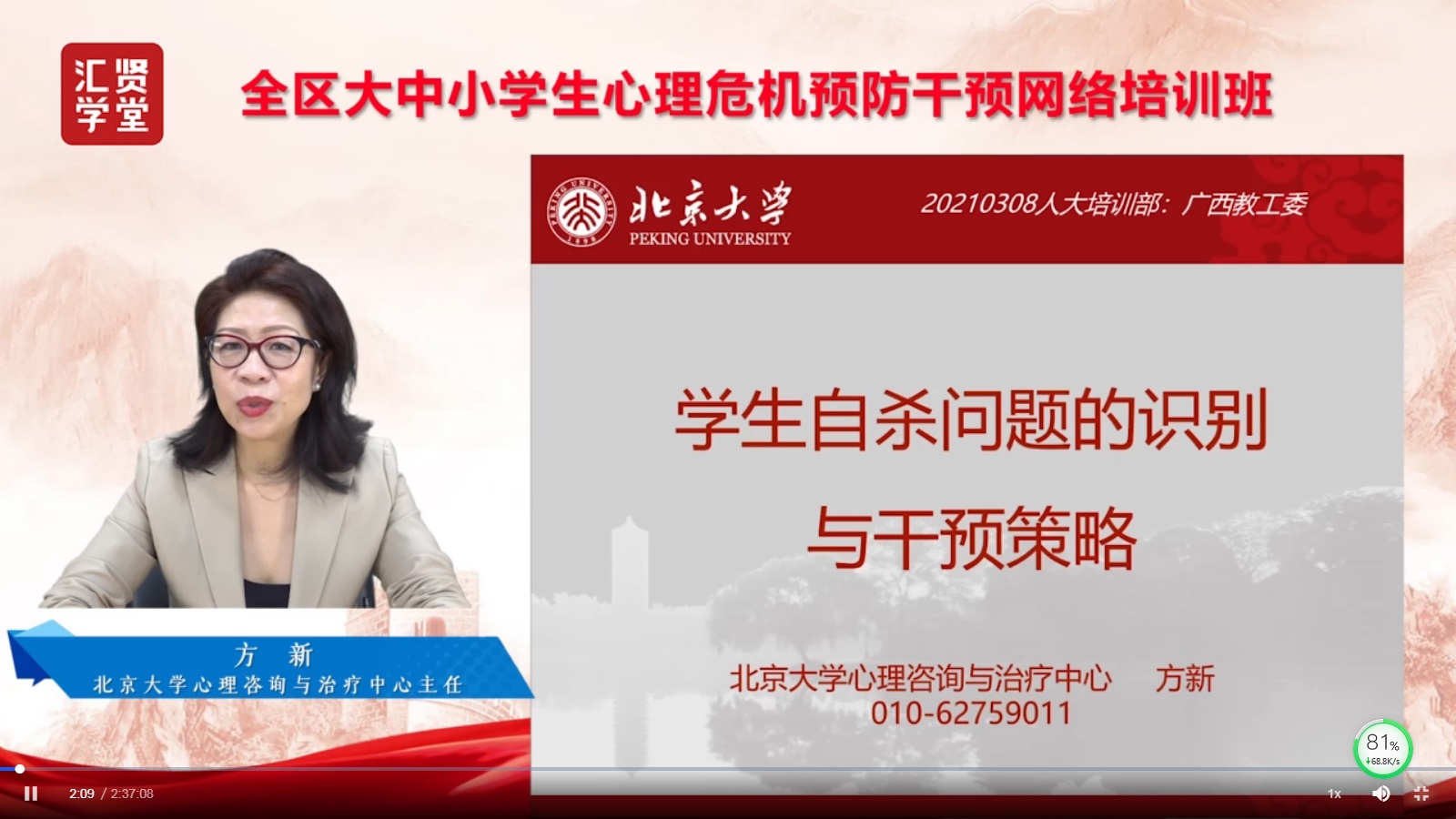 第二场培训为北京大学医院心理治疗与咨询中心主任方新老师讲授关于《学生自杀问题识别与干预策略》的课程。