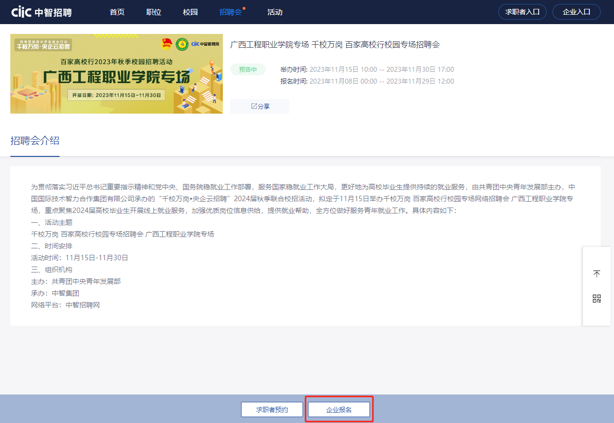 在企业后台进入“招聘会”模块,选择本次招聘会,点击“报名参会”后进行“添加职位”完成报名。