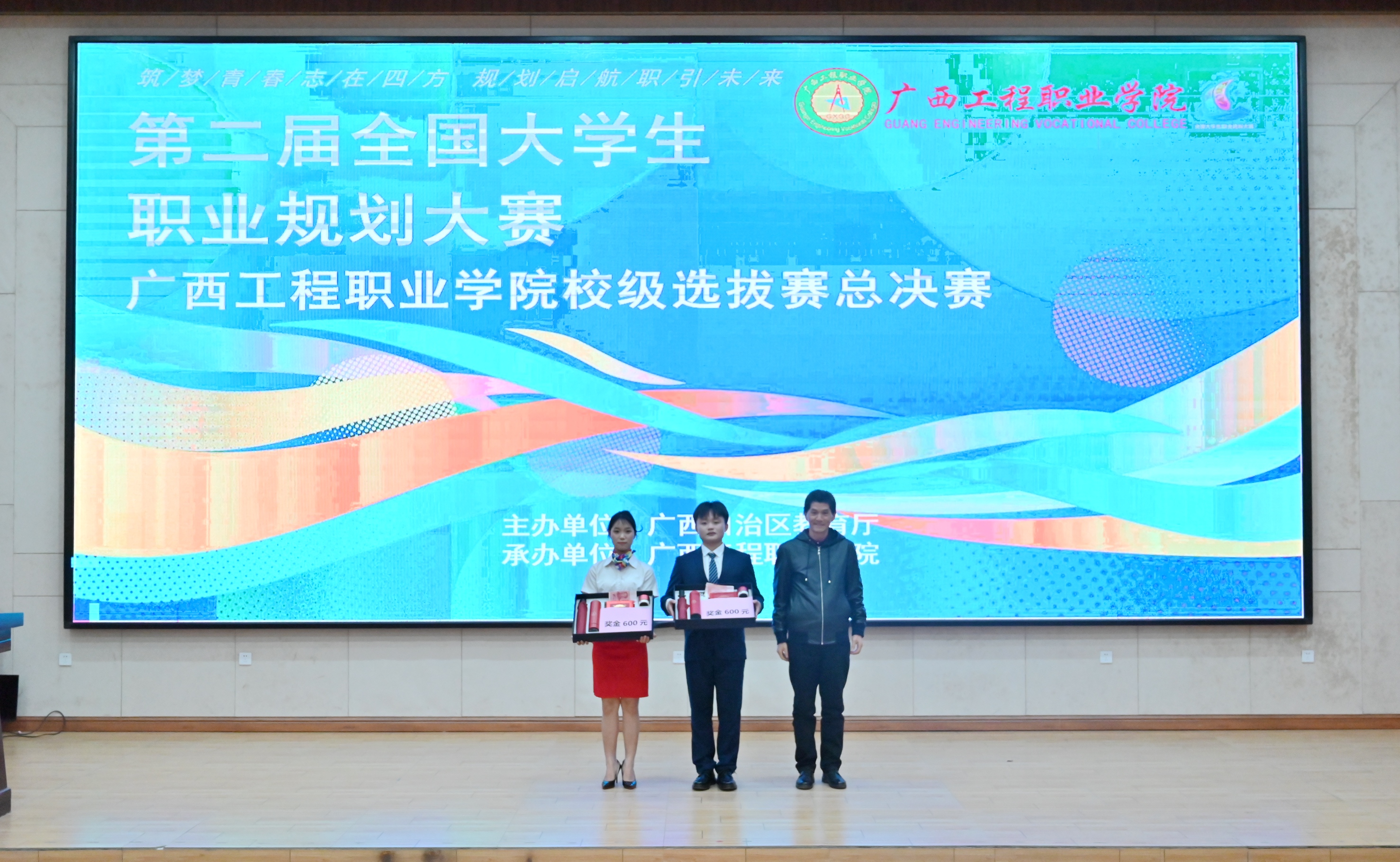 广西初晨广告有限公司经理吕泽滨、鸿仁科技传媒有限公司人事经理张兰为获得铜奖的同学颁奖