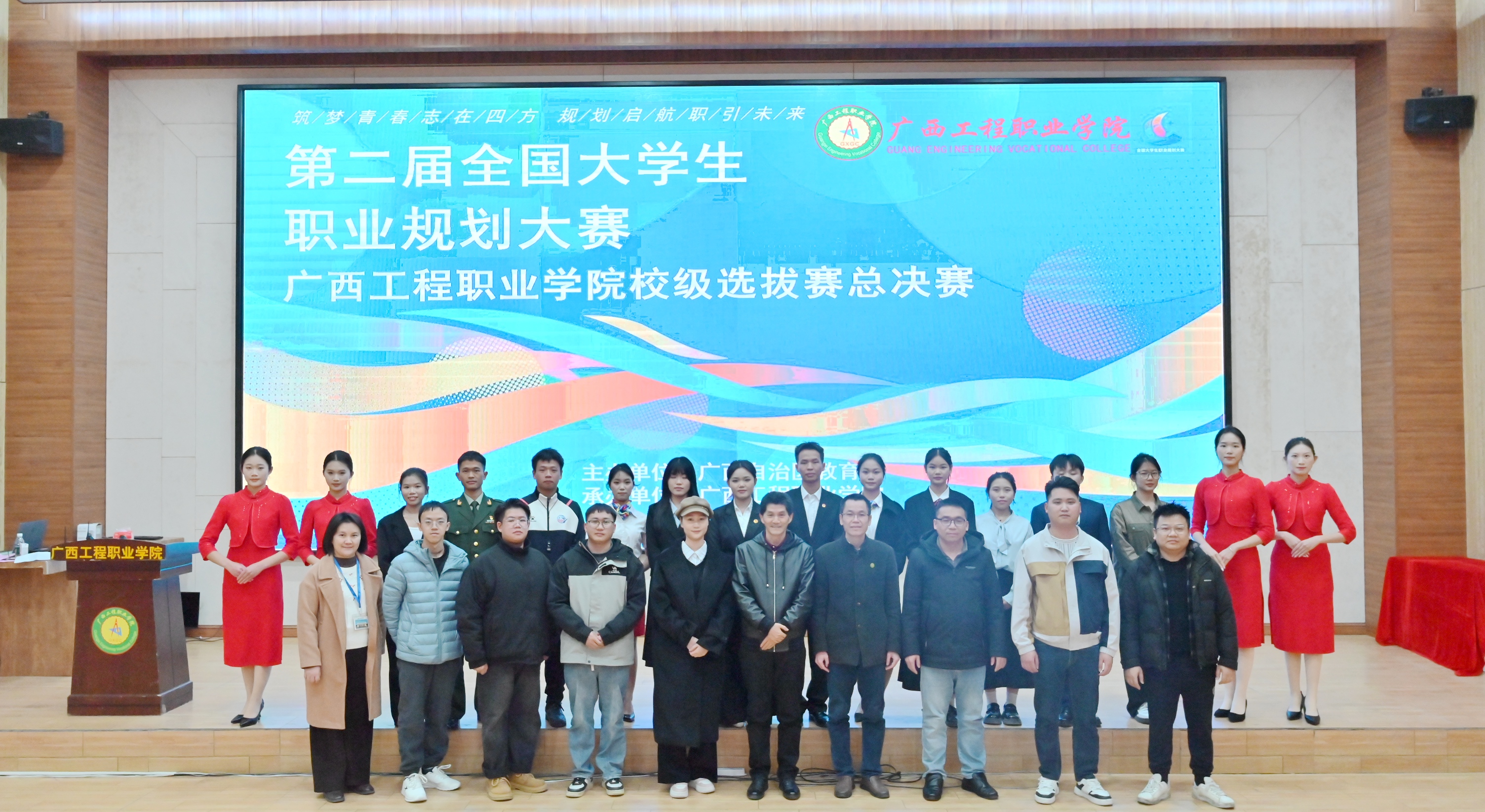 评委席:中国移动通讯集团平果分公司副总经理马明祥、鸿仁科技传媒有限公司人事经理张兰、教育学院办公室主任梁义平、经济管理学院副教授刘忠略、土木工程学院高级工程师汪弋钦