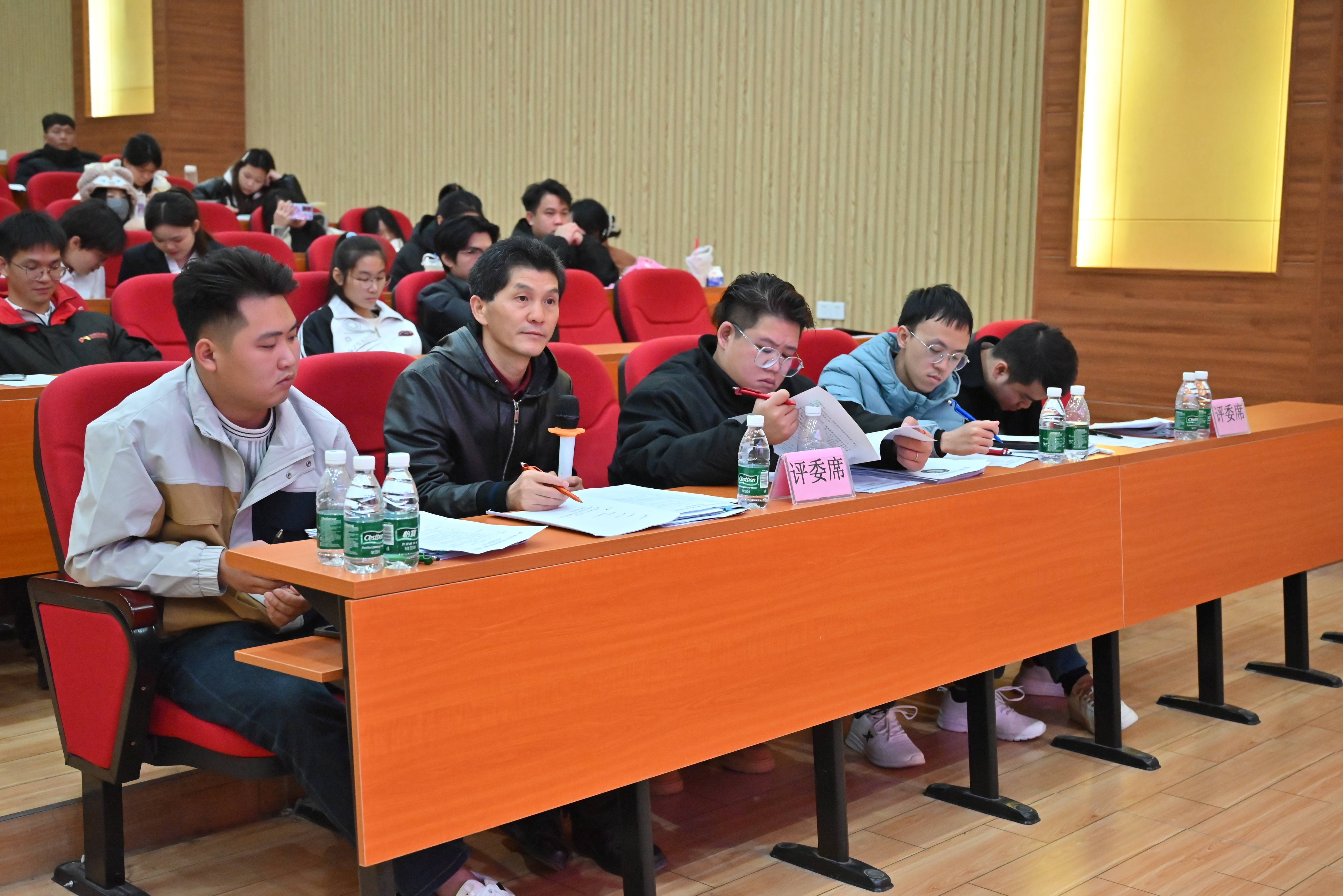 评委席:大学园区管理服务中心指导专家梁宏、广西初晨广告有限公司经理吕泽滨、艺术设计学院党支部副书记赵志辉、铁道与航空学院助理工程师苏世淋、汽车与机电学院助理工程师成天祺