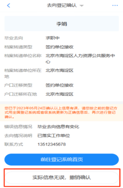 如果毕业生提交确认信息有误后发现实际信息无误,可返回“去向登记确认”界面,点击“实际信息无误,撤销确认”,撤销后重新选择“信息无误,确认登记去向”提交。