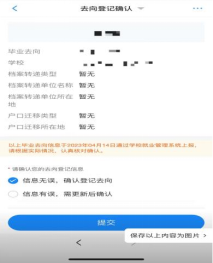 如果信息无误,点击“信息无误,确认登记去向”提交。毕业生档案信息以毕业生提供给学院的邮寄档案信息为准。户口未迁入学校的同学其信息不变,户口迁入学校的同学,按学校户籍部门要求办理迁出手续。