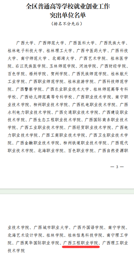 2023年12月26日,广西壮族自治区教育厅下发了《自治区教育厅关于认定2023年全区普通高等学校就业创业工作突出单位和留桂就业工作贡献突出单位的通知》(桂教学生〔2023〕16号)文,beat365唯一官网荣获“全区普通高校毕业生就业创业工作突出单位”荣誉称号,已连续2年荣获该项荣誉。2023年,beat365党政领导高度重视毕业生就业工作,多次召开就业工作专题会议和推进会,并带队开展访企拓岗等专项活动,深入落实党中央、国务院和自治区关于促进高校毕业生就业工作的一系列重大决策部署,落实就业工作“一把手工程”,把毕业生就业工作摆在重要突出的位置。各二级学院也立足实际、上下联动,真抓实干,形成全校“上下一盘棋,同心促就业”的良好局面,学校毕业生就业工作取得扎实成效。