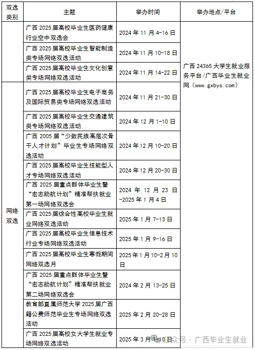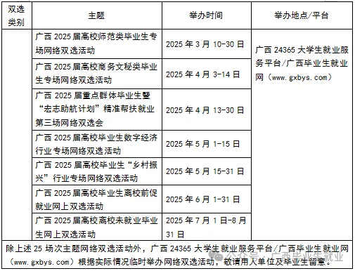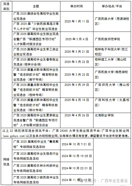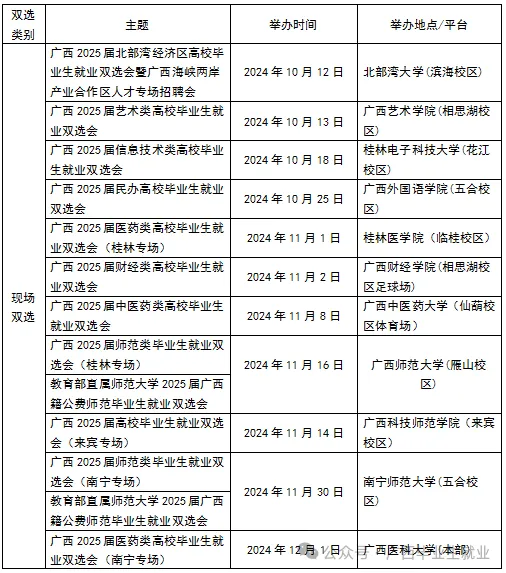 活动期间,计划在全区高校组织举办大型就业双选会47场(详见下方列表),提供岗位不少于25万个,指导高校组织不少于500场就业育人主题教育活动。