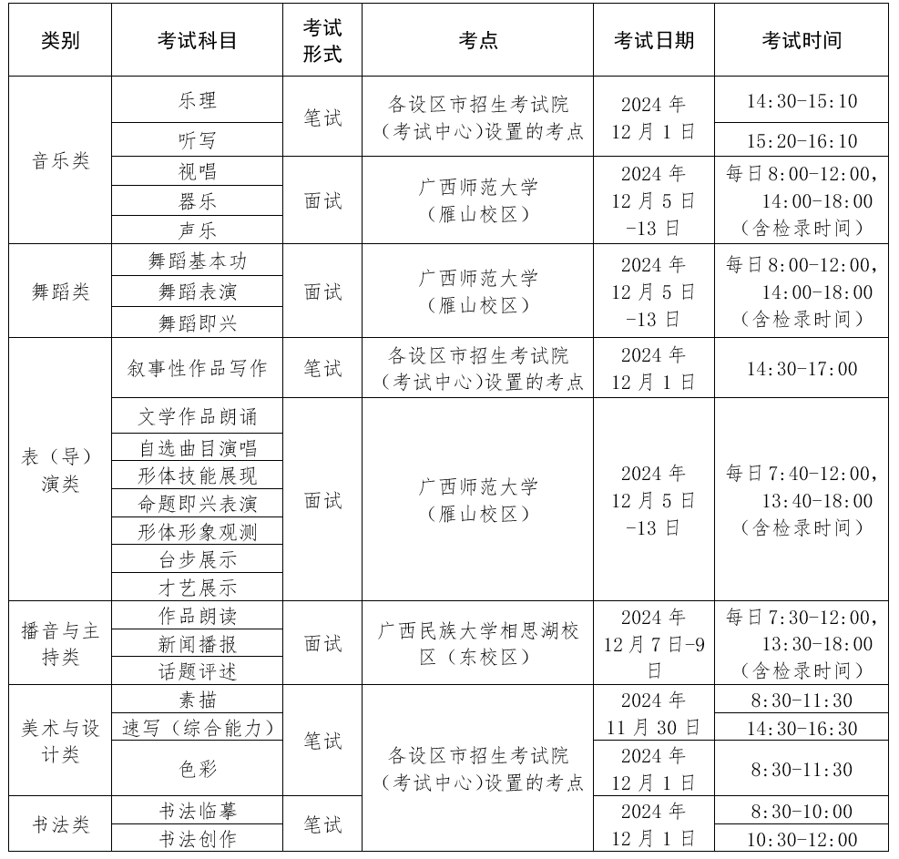 (一)音乐类。笔试科目(乐理、听写):各设区市招生考试院(考试中心)设置的考点;面试科目(视唱、器乐、声乐):广西师范大学雁山校区(地址:桂林市雁山区雁中路1号)。